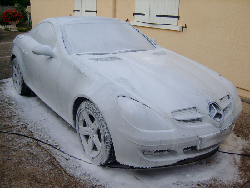 Le traitement et la cire ont rehaussé l'éclat et la brillance de cette voiture pourtant bien entretenue.Ici le prélavage au canon à mousse: